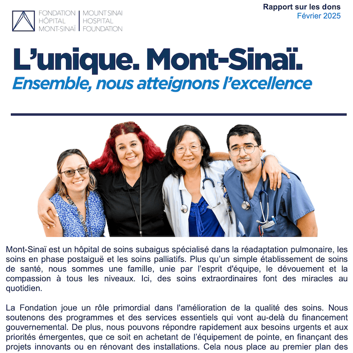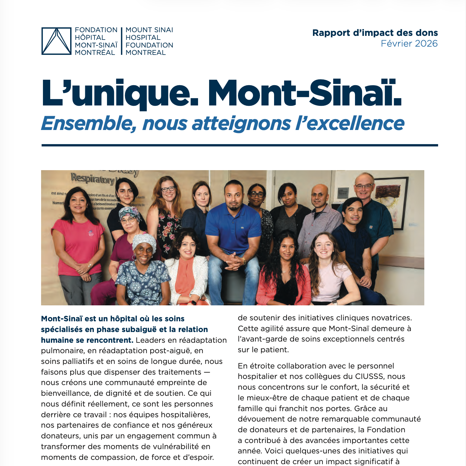 La Fondation Hôpital Mont-Sinaï contribue au bien-être, au confort et à la santé des patients, de leur famille et de notre personnel en offrant des programmes et des services de santé de qualité supérieure.